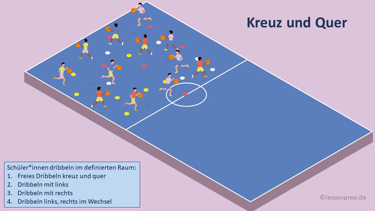 - Zunächst freies Bewegen mit Ball definierten Raum. Möglich mit den unterschiedlichsten Bällen (Basketball, Handball, Fußball,…).