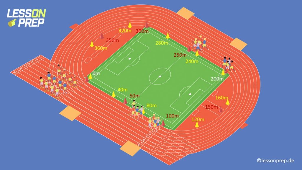 - Als Hilfestellung sollten die Hütchen wieder alle 40 und 50m aufgestellt. Zusammen mit den Pfiffen (z.B. alle 15 Sekunden), haben die SuS eine gute Orientierung für das Lauftempo.