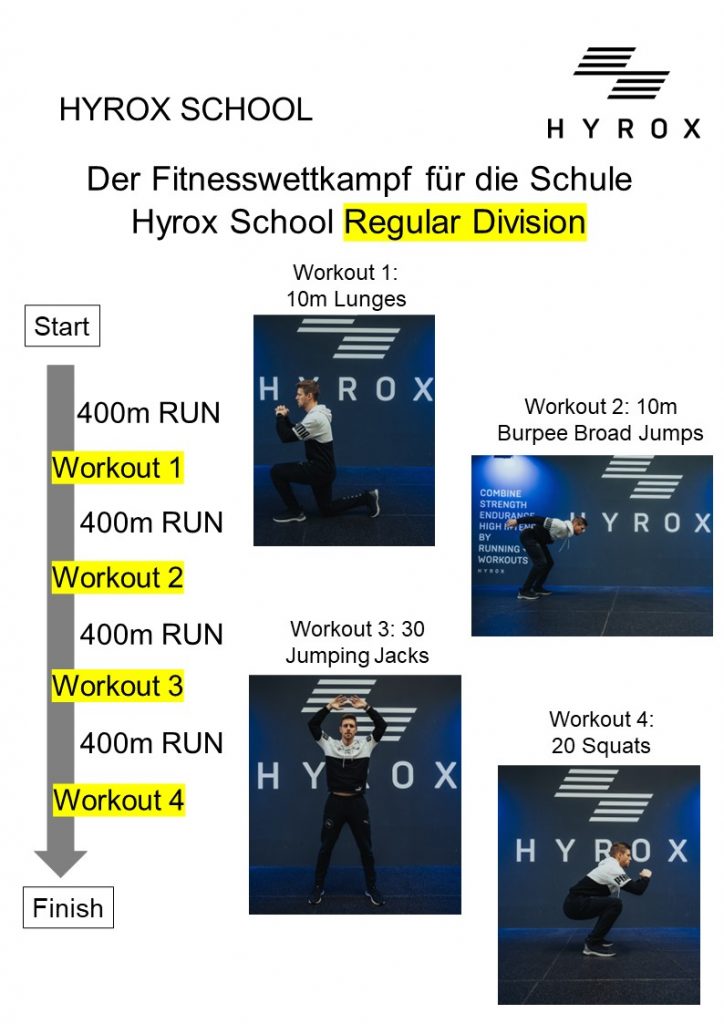 In einer innovativen Mischung aus vier 400m Läufen, die sich mit 4 unterschiedlichen Workouts abwechseln, können die Schülerinnen und Schüler ihr persönliches Fitnesslevel austesten. HYROX School ist damit eine abwechslungsreichere Alternative zum Cooper-Test, der bei Schülerinnen und Schülern eher unbeliebt ist.